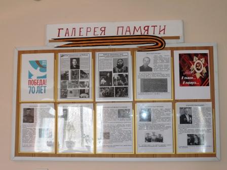 Представленная экспозиция рассказывает об участниках Великой Отечественной войны, об их сражениях, подвигах, боевых наградах. В галереи памяти представлены фотоснимки военных лет, наградные листы, снимки из семейных архивов отцов, дедов и прадедов участников Великой Отечественной войны.